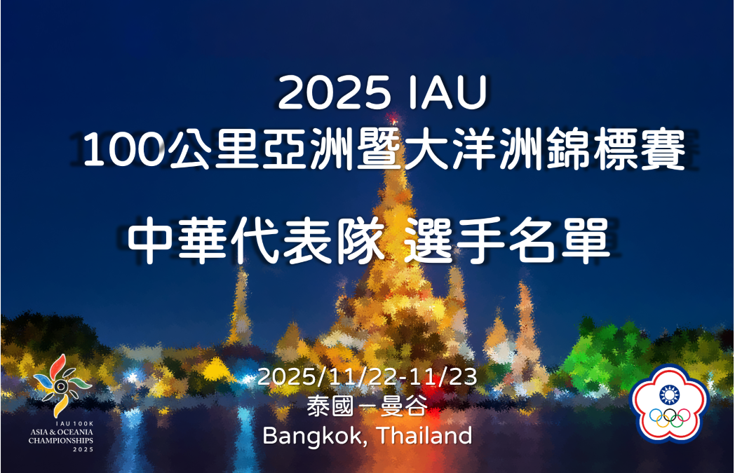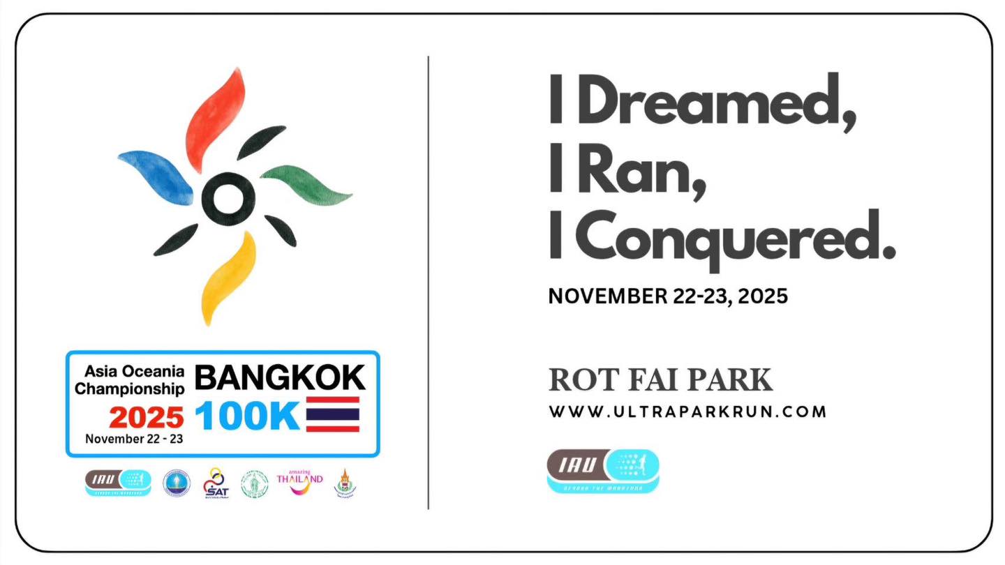 2025 IAU 100公里亞洲暨大洋洲錦標賽,將在11月22日至23日於泰國-曼谷(Bangkok, Thailand) 舉辦。近年來,泰國超馬圈逐漸展露頭角,這將是泰國首次主辦洲際錦標賽。本場盛會將聚集來自亞太各國超馬運動員們,及近百位工作人員的投入與參與。今年中華隊派出:蔡峻宇、朱宏仁、李銘峰,共三位男子好手出戰,前往有東方威尼斯稱號的天使之城-曼谷,一起登上亞太超馬舞台!