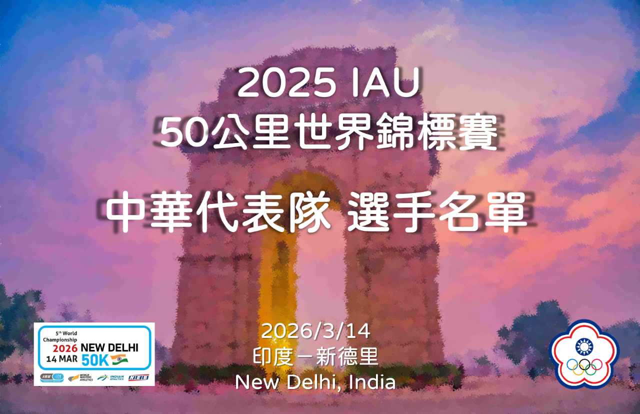 2025 IAU 50公里世界錦標賽,延期不停辦,將在2026年3月14日於印度-新德里(New Delhi, India) 開跑。近年來,印度超馬圈逐漸嶄露頭角,近五年來主辦多場國際錦標賽。本場盛會將聚集來自世界各國超馬運動員們,及數百位工作人員的投入與參與。今年中華隊派出:林志傑、李智群、戴維育、林冠汝、劉素雅、邱靖貽,共3男3女,六位好手出戰,飛往印度首都城市-新德里,一起登上世界超馬舞台!